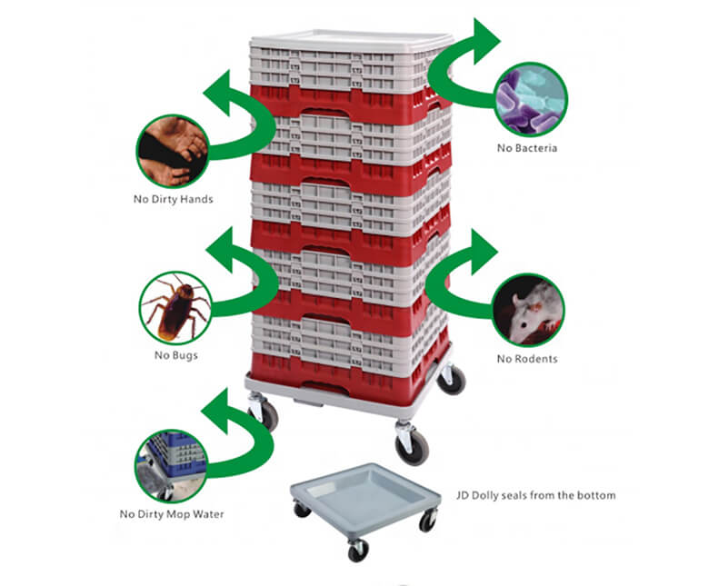 ● Innovative design. The open inside compartments provide thorough circulation of water and cleaning solution and promote quick and thorough drying. The closed outer wall system is designed for optimum cleaning: keeping water and chemicals inside the rack that will reduce waste.