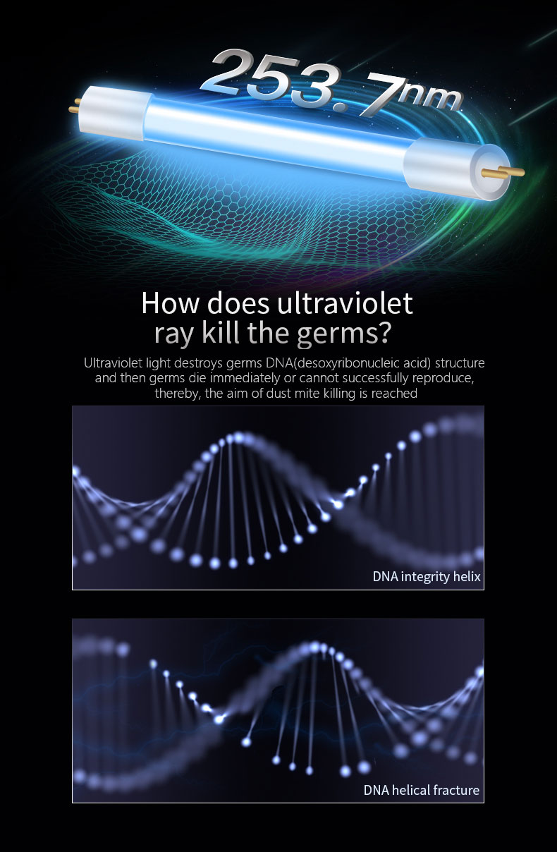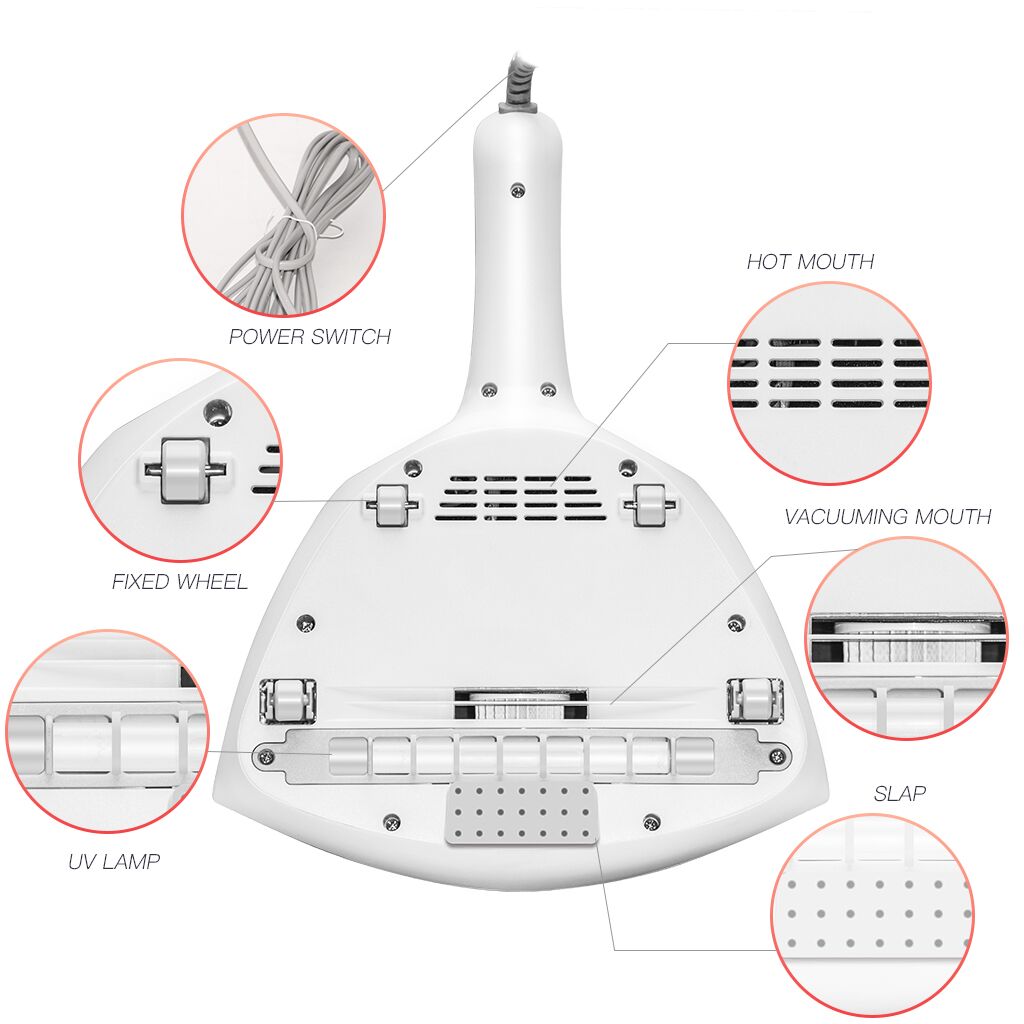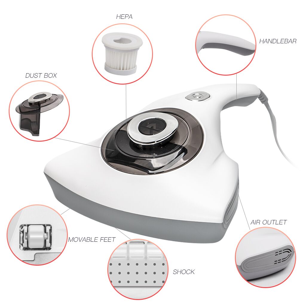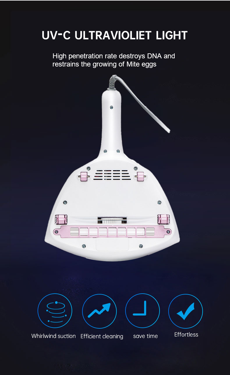 UV light, high frequency beat, 300W strong suction,white, kill and absorb away dust and mites to achieve deep dust removal and mite removal; hot air blowing fabric to achieve dehumidification effect; three touch switch to prevent UV leakage, reassure for you; visual dust box,full of dust