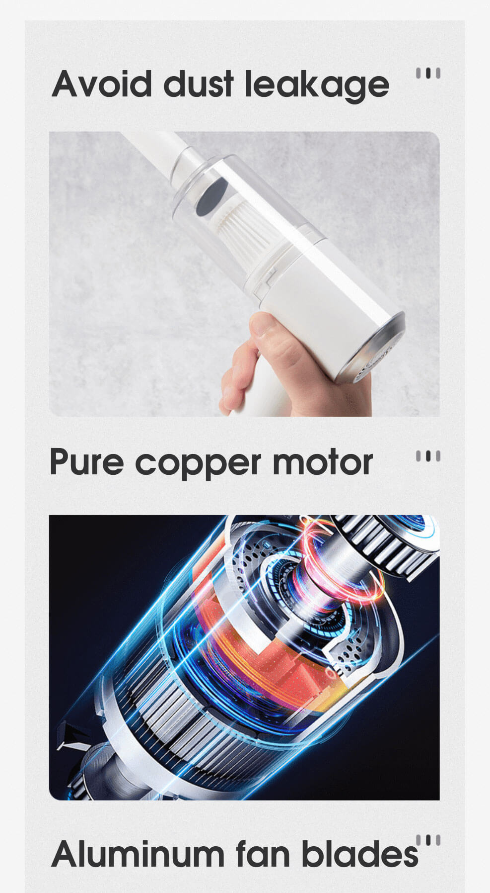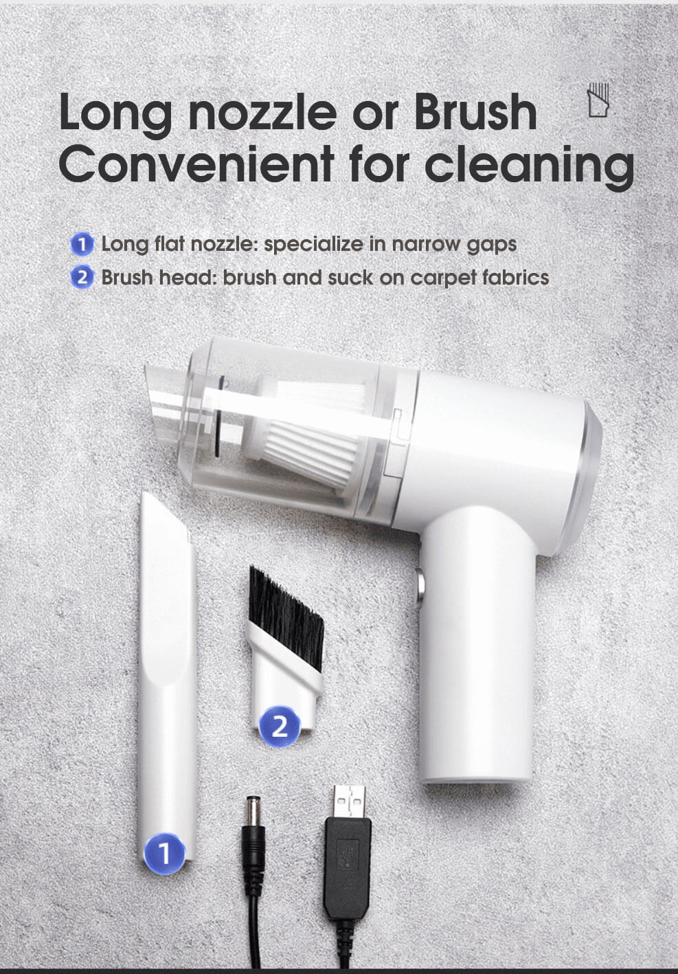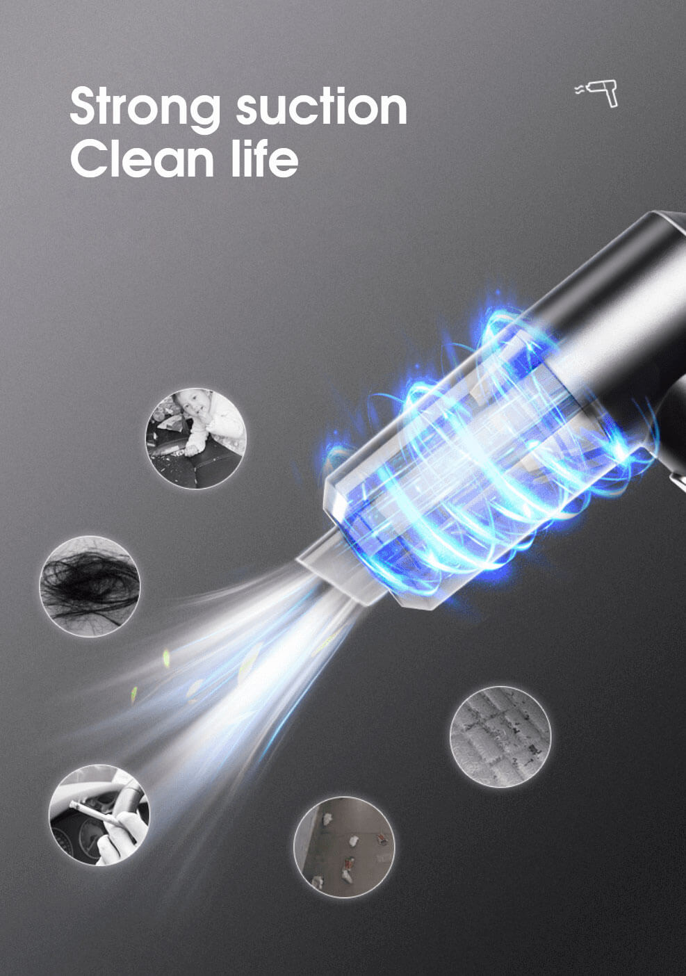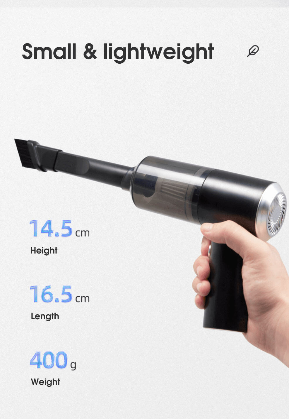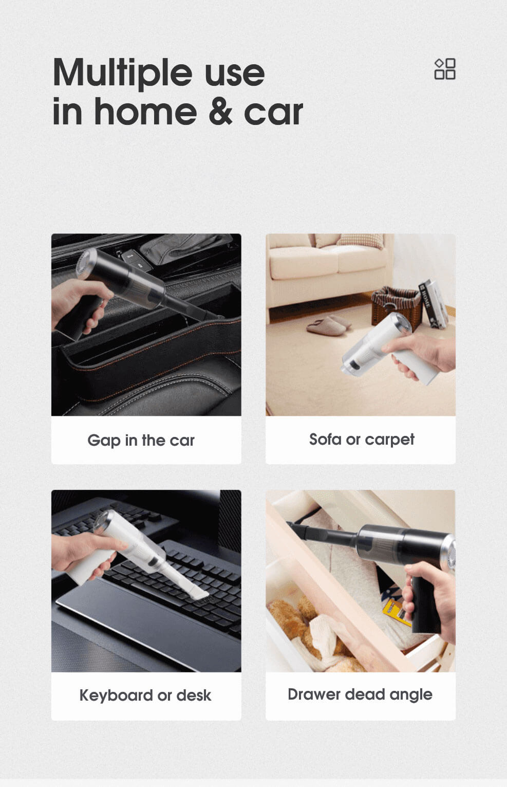 The small handheld vacuum cleaner helps you clean the seams of the sofa, the corners of the stairs, the cracks in cars and other hard-to-reach places, whether at home or in your vehicle.