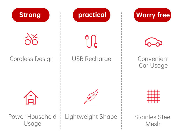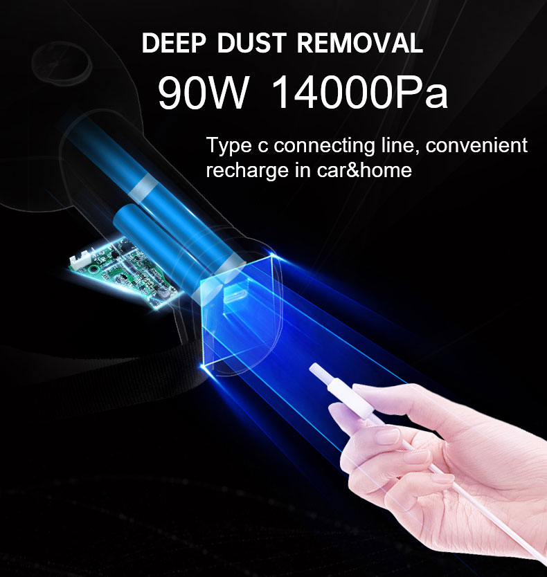 Independent research and development of vehicle mounted vacuum cleaner, smart body easy to collect and handle, small size and large energy, strong power output from the brushless motor; type C charging, long endurance, portable and easy to clean when going out; fine steel filter screen HEPa flter wear-resistant and durable, not easy to aging; plug in extension tube and floor brush and other brush heads transform into a household vacuum cleaner, one machine dual-purpose switch at will.